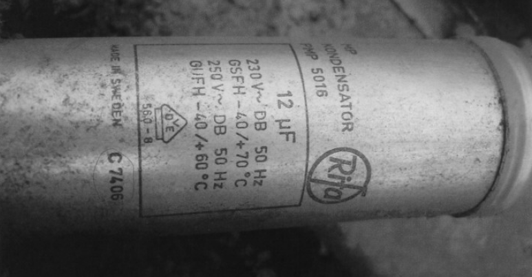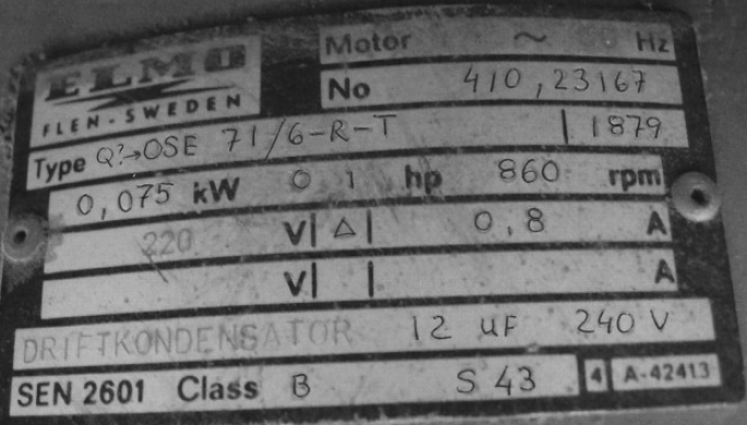 Bilden här nedan visar skylten med typdata för vår originalfläkt med tillhörande tyristor där man kan läsa av de värden man behöver på en ny.