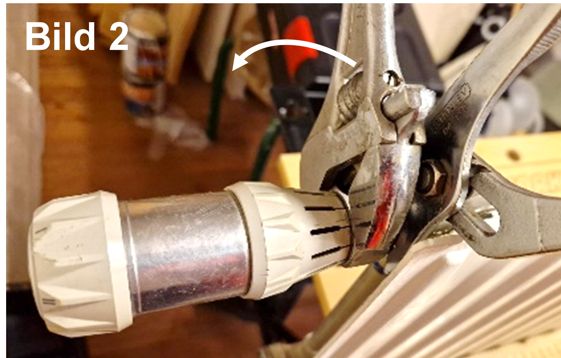 också regleringsstiftet i termostaten (vid pilen i Bild 4) synlig i den del som sitter kvar på elementet. Tryck på regleringsstiftet tills det lossnar med något föremål, fingrar duger inte. Fungerar inte det så pröva med att slå lite lätt, men försiktigt! När stiftet lossnat ska det gå relativt lätt att trycka in det några millimetrar.