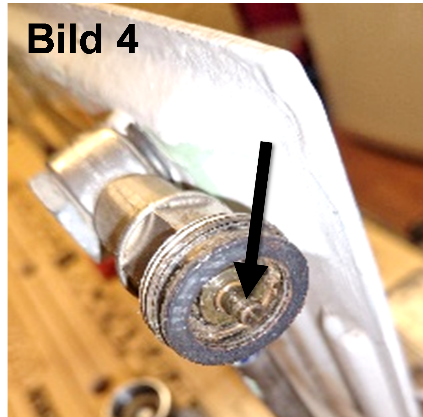 E) Ta nu bort gammalt silikon runt plastpinnen i vredet (Bild 3) och runt regleringsstiftet i termostaten (Bild 4) och fyll på med nytt silikon. Smeta även silikon i gängorna! Sätt tillbaka vredet på termostaten och dra åt, men inte för hårt.